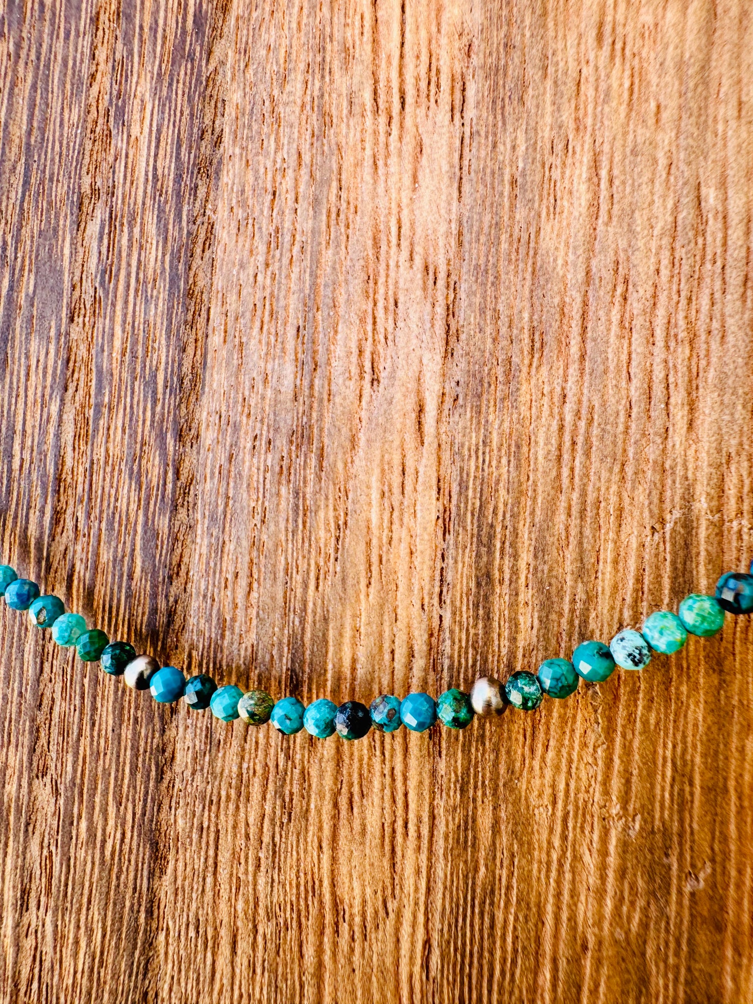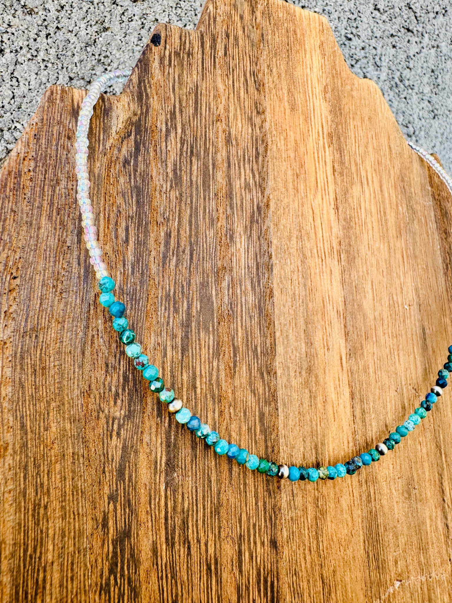 This dainty 3MM turquoise choker offers genuine faceted turquoise beads paired with authentic Navajo pearls and delicate seed beads. This dainty necklace brings a touch of handmade western vibrant color to any outfit.