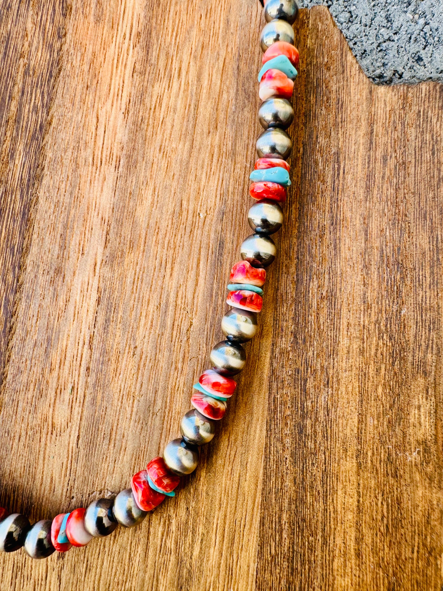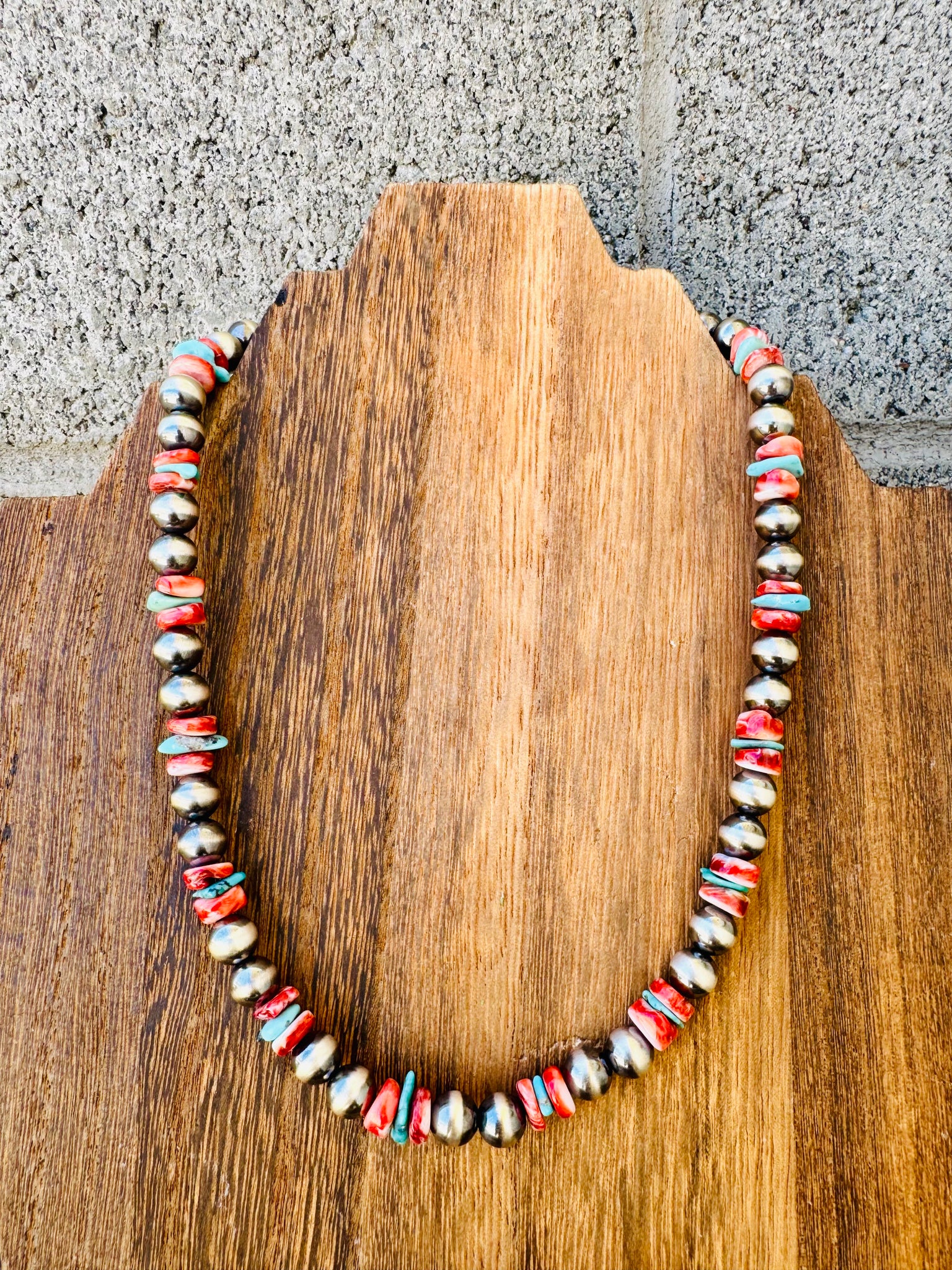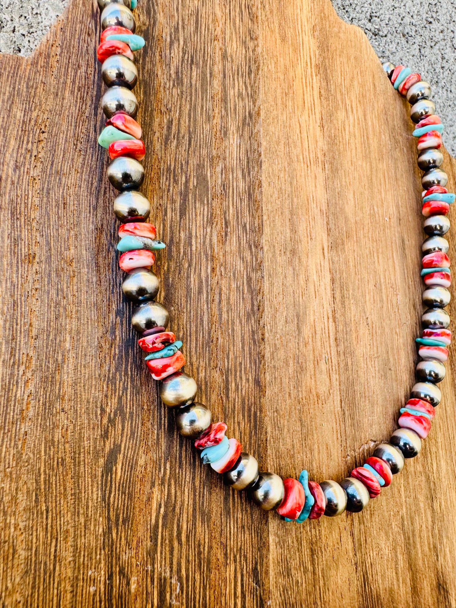 This necklace is BOLD! Big Navajo Pearls + red spiny oyster + turquoise = A statement piece you will love for years to come. Layer this beauty with your other Navajo Pearls, Turquoise or Spiny oysters to create a bold neck stack!
