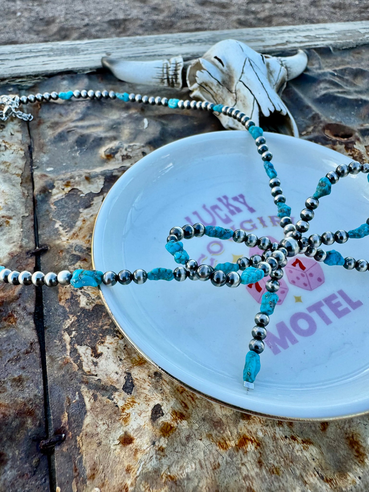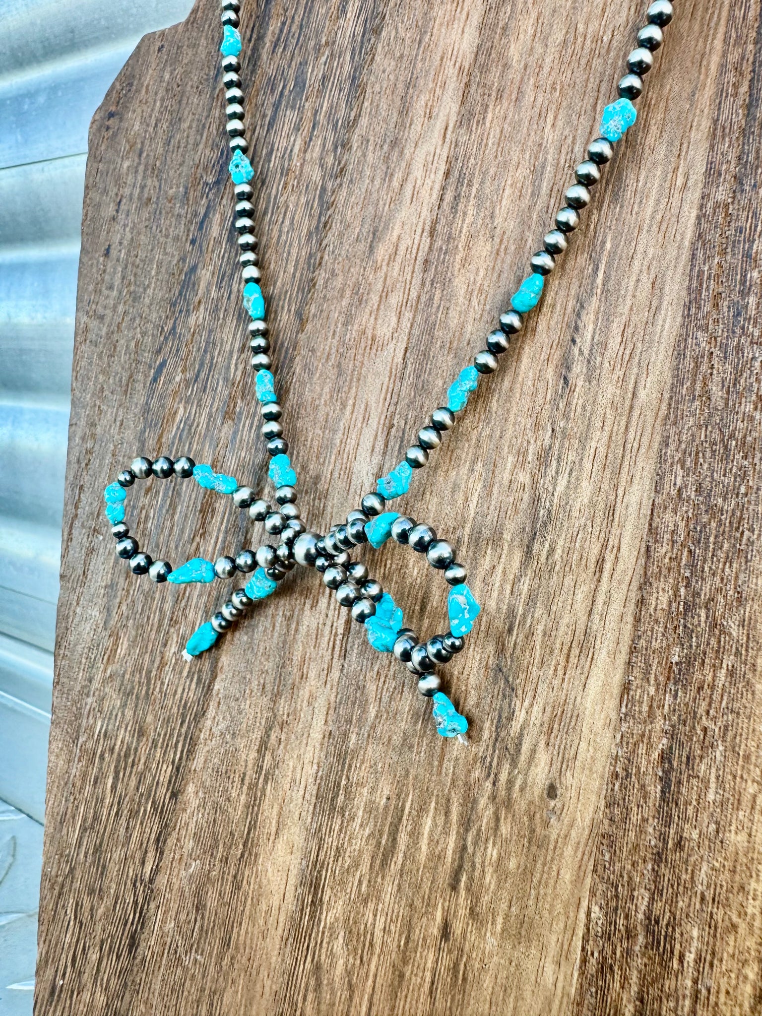 This bow tie necklace is stunning! The genuine turquoise adds a fun pop of color against the sterling silver Navajo Pearls. This one can be worn as business casual or looks super cute with your fav' graphic tee!