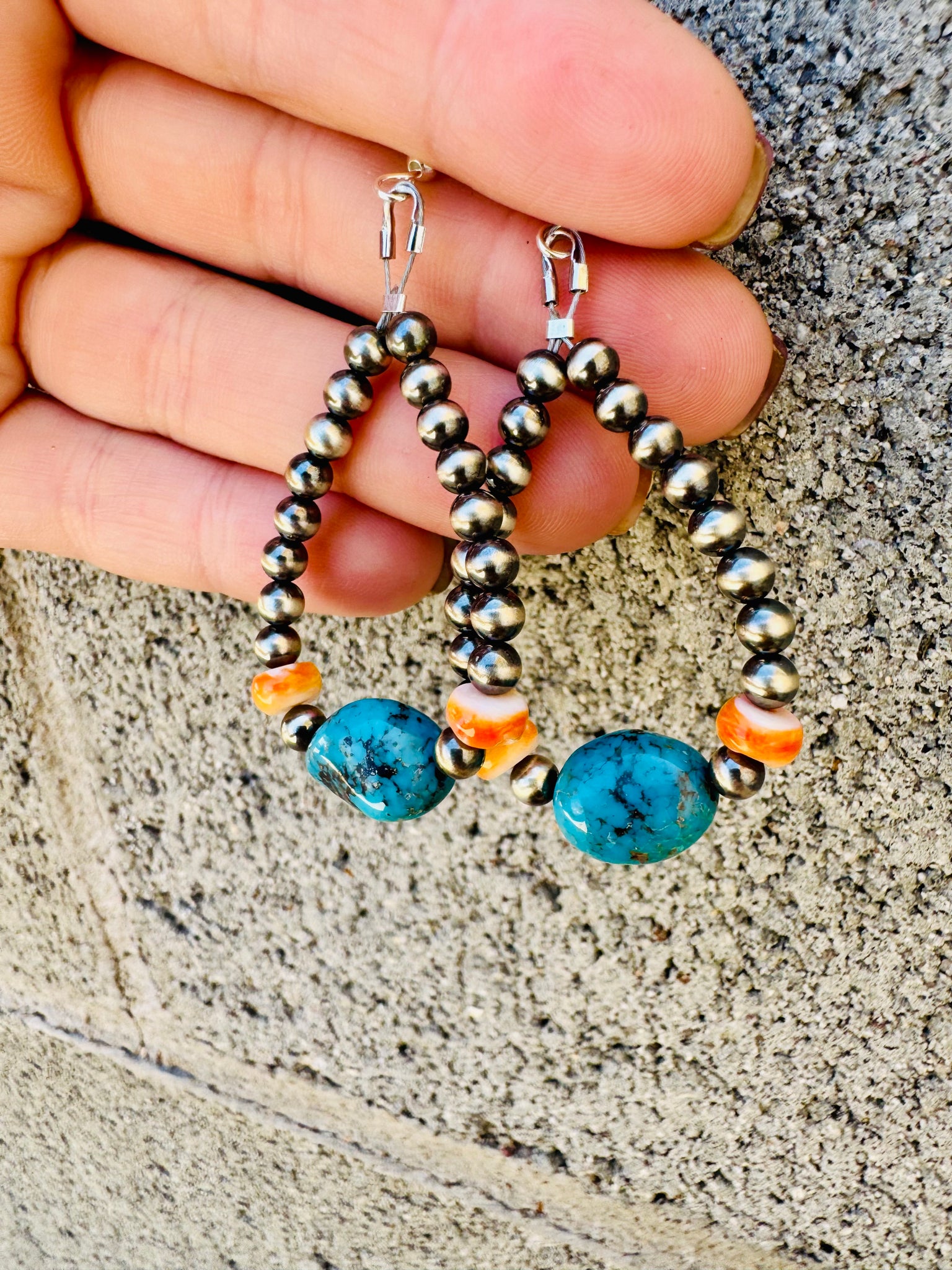 Add some southwestern vibes to your style with these stunning Navajo Pearl teardrop earrings, featuring genuine turquoise nuggets and vibrant orange spiny oyster. The unique teardrop shape shows off the authentic Navajo Pearls, adding a touch of western and color to any look.