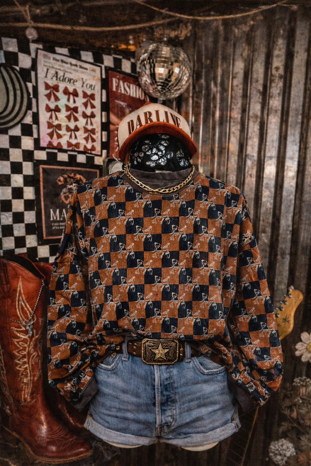 Checkers, plus a bronc... meet the Buckin Checkmate Sweatshirt! This sweatshirt is super soft with a light fleece lining. Wide cuffs and bottom hem give some extra style to this soon to be favorite!